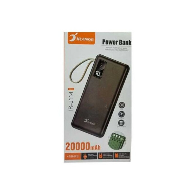 پاوربانک آیرنج مدلIR-J114 دارای 20000میلی آمپر ساعت و دارای شارژر فست شارژ می باشد که یکی از محصولات شرکت آیرنج می باشد که مخاطبین خاص خود را دارد.